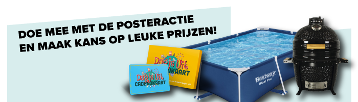 Nou, alleen maar super toffe prijzen natuurlijk! Als hoofdprijs geven wij een Kamado houtskoolbarbecue weg ter waarde van € 189,-. Dat wordt gegarandeerd de ster van jouw zomerse BBQ-feestjes! Als tweede prijs verloten wij maar liefst twee keer een Dagje Uit cadeaukaart ter waarde van € 100,-. Dat wordt genieten van een onvergetelijk dagje weg, bijvoorbeeld naar Slagharen, Plopsaland of het Scheepsvaartmuseum! En alsof dat nog niet genoeg is, maak je als derde prijs kans op één van de vier Bestway zwembaden. Plons erop los en beleef een spetterende zomer!